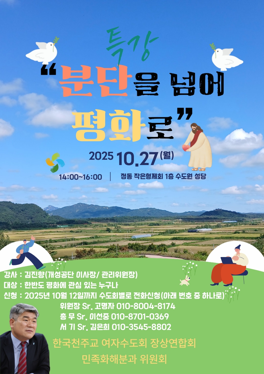 생명평화 [특강]"분단을 넘어 평화로" 2025-10-12 + 평화를 빕니다! 장상연합회 민족화해분과에서 마련한 특강에 모든 분들을 초대합니다. 그 어느때보다 한반도 평화를 위하여 함께 마음과 기도를 모아야할 때입니다. 아래의 번호로 신청 후 참석하시면 됩니다. 이전글[교육]제57회 가톨릭 에코포럼 다음글[연대] 10.29 이태원참사 3주기 기억식 '별들과 함께 진실과 정의로' 목록