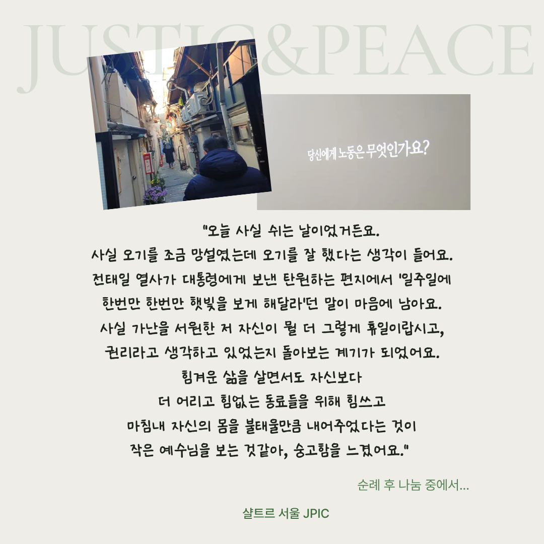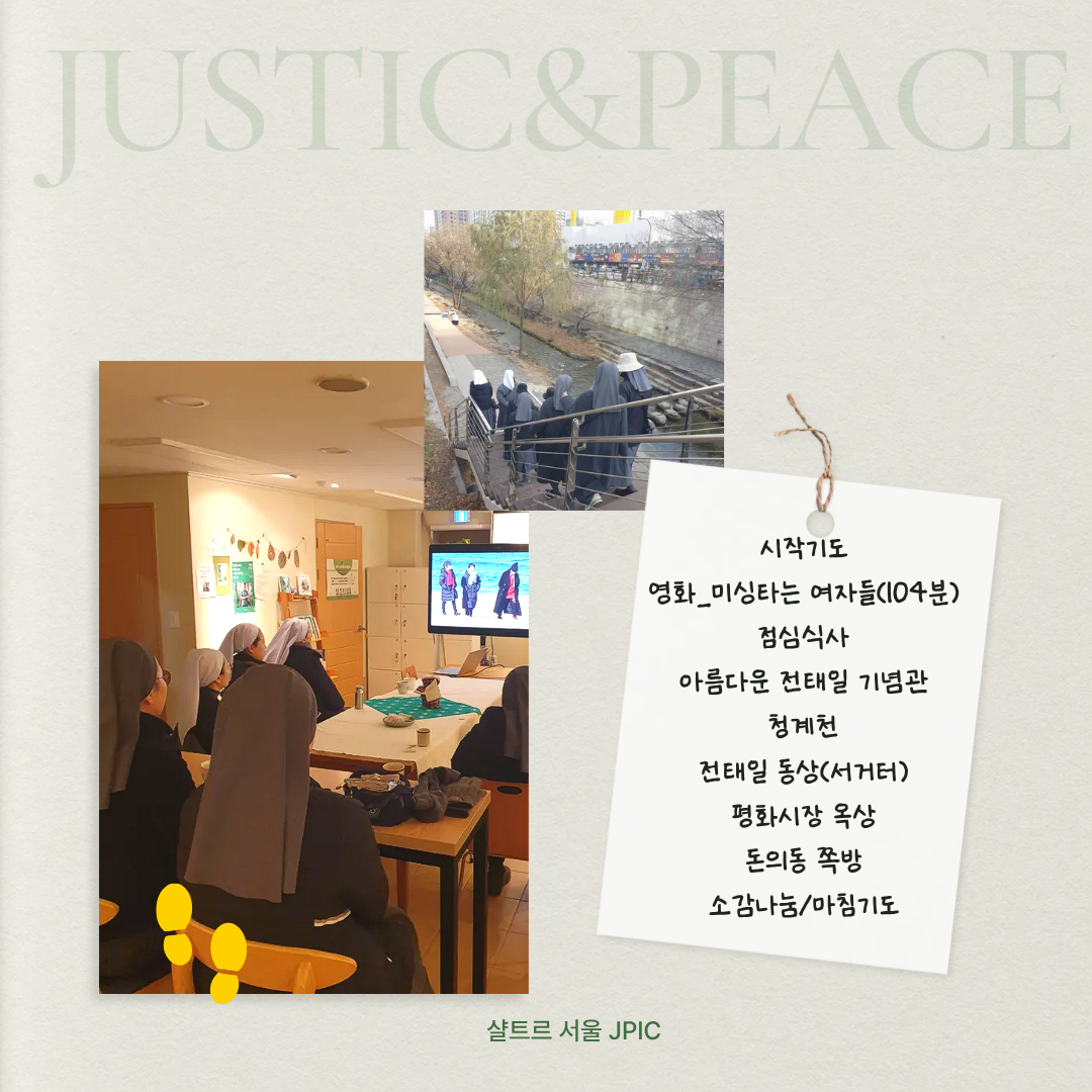생명평화 20251206_청계노동현장 탐방 2025-12-28 지난 대림 2주일(인권주일) 사회교리주간을 맞아 명동과 아주 가까운 곳, 청계천로에 살아 숨쉬는 노동 인권역사의 현장을 찾았습니다. 1968년 16세부터 평화시장에서 미싱보조일을 시작하여 전태일 열사와 같은 시기를 사셨던 이숙희 선생님께서 동행해 주셨습니다. 이전글[연대] 11.26 정의기억연대 수요시위를 다녀오며 다음글2025 <모두의 성탄> 목록