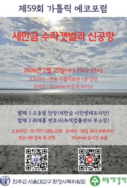 생명평화 [교육] 제59회 가톨릭 에코포럼_새만금과 신공항 2026-02-19 2월 25일(수) 제59회 가톨릭 에코포럼의 주제는 ‘새만금 수라갯벌과 신공항’입니다. 생태계 파괴를 전제로 한 인간 중심적 사고와 무분별한 개발이 생태계와 지역 공동체, 더 나아가 미래 세대에 어떤 영향을 미치는지 성찰하고 통합적 생태의 시각에서 공공정책과 사회적 선택에 대해 함께 고민해 보는 시간입니다. 일시 : 2026년 2월 25일(수) 19:00~21:00 장소 : 서울 명동 가톨릭회관 1층 강당 또는 Youtube 비공개 라이브 송출 대상 : 일반신자, 수도자, 성직자 누구나 주제 : "새만금 수라갯벌과 신공항" 강사 : 발제1 오동필 단장(새만금 시민생태조사단), 발제2 최재홍 변호사(녹색법률센터 부소장) ☎ 오프라인 교육 신청 : https://buly.kr/Csip3IP 링크 또는 포스터의 QR. 환경사목위원회 02-727-2278, 2283. ???? 더 많은 분들이 함께할 수 있도록 에코포럼 발제는 Youtube 비공개 링크를 통해 실시간으로 송출되며, 당일 18시 30분에 오픈됩니다. ????온라인 교육 참여 : https://buly.kr/AF1fGTl 이전글[미사] 탈핵 & 핵발전소 반대 시국미사 다음글[교육]JPIC 수도자 전환학교 3월 (선착순) 목록
