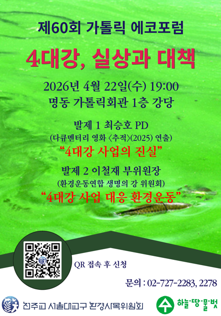 생명평화 [에코포럼] "생명의 강은 다시 흘러야 합니다." 2026-04-21 제60회 가톨릭 에코포럼 안내 환경사목위원회에서는 4월 22일(수) 제60회 가톨릭 에코포럼을 개최합니다. 이번 주제는 "4대강, 실상과 대책"입니다. 이번 에코포럼에서는 4대강 사업의 실상을 되짚어보고, 생명의 강을 지키기 위한 환경운동의 여정을 공유하며 통합적 생태의 시각에서 무분별한 개발이 미래 세대에 미친 영향을 성찰하고자 합니다. 또한 강의 자연성 회복을 위한 올바른 사회적 선택에 대해 함께 지혜를 모으는 시간을 가지고 우리 공동체의 과제를 고민해 보고자 합니다. 일시 : 2026년 4월 22일(수) 19:00~21:00 장소 : 서울 명동 가톨릭회관 1층 강당 대상 : 일반신자, 수도자, 성직자 누구나 주제 : "4대강, 실상과 대책" 강사 : 발제1 최승호 PD(다큐멘터리 영화 <추적>(2025) 연출), 발제2 이철재 부위원장(환경운동연합 생명의 강 위원회) ☎ 오프라인 교육 신청 : https://buly.kr/6Xo9fLP 링크 또는 포스터의 QR. 환경사목위원회 02-727-2278, 2283. 이전글세월호 참사 12주기 추모미사 목록
