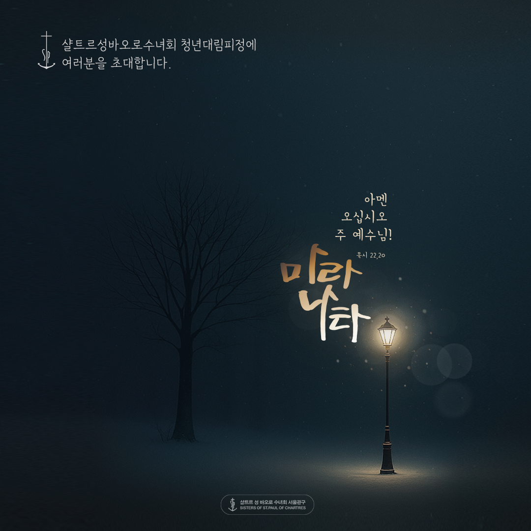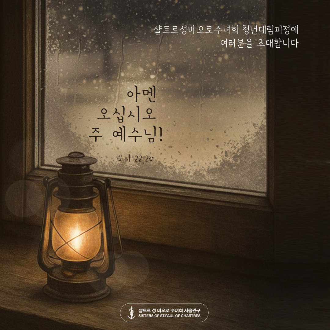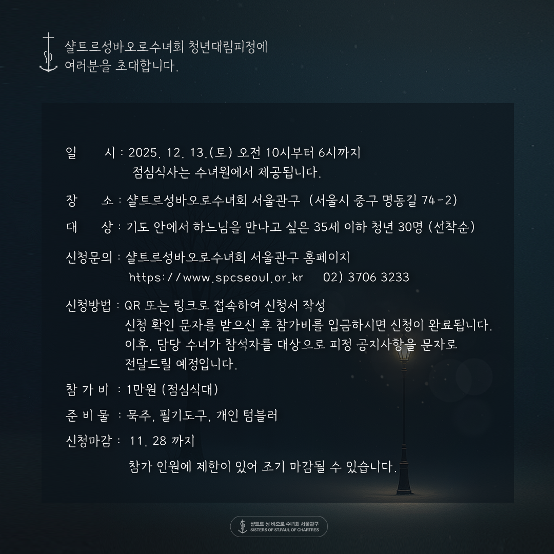 청년 PICK & TALK 2025 대림청년피정에 여러분을 초대합니다 2025-10-29 일 시 : 2025. 12. 13.(토) 오전 10시부터 6시까지 장 소 : 샬트르성바오로수녀회 서울관구 바오로홀 (서울시 중구 명동길 74-2 명동성당 성모동산 뒷편) 대 상 : 기도 안에서 하느님을 만나고 싶은 35세 이하 청년 30명 (선착순) 나이 제한으로 신청이 불가할 수 있습니다 신청 문의 : 샬트르성바오로수녀회 서울관구 홈페이지 https://www.spcseoul.or.kr 02)3706.3233 / 010.3627.5071 이혜영 루갈다 수녀 신청 방법 : QR 또는 링크로 접속하여 신청서 작성 https://forms.gle/GhtrNnAjyS9Wd1JY6 신청 확인 문자를 받으신 후 참가비를 입금하시면 신청이 완료됩니다. 이후, 담당 수녀가 피정 공지사항을 문자로 보내드립니다. 참 가 비 : 1만원 준 비 물 : 묵주, 필기도구, 개인 텀블러 신청마감 : 2025. 11. 28. (금) 이전글<기도8-그 외딴 곳> 여덟 번째 이야기 다음글예수님의 작은 벗들 "성지순례" 목록