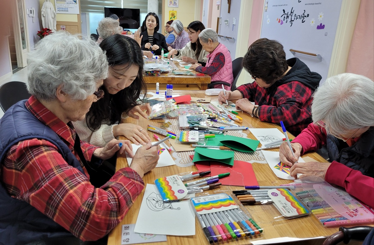 청년 PICK & TALK 사랑의 나눔 1 - 성우회 어르신 방문 2025-12-15 올해 사랑의 나눔, 첫번째로 2025년 12월14일 성우회(양로시설)에 다섯 명의 예벗이 방문했습니다. 예벗의 재능기부로 성탄카드 만들기 재료를 준비, 예벗의 기부금으로 마련한 성탄 목도리를 선물로 준비했습니다. 어르신들과 함께 성탄카드를 만들고 간식을 먹으며 이야기를 나누는 시간, 성탄 목도리를 선물하는 시간, 서로가 서로에게 사랑을 주고 받으며 마음이 풍성해지는 시간이었습니다. 예벗 소개와 인사하기 카드 그림 색칠하기 간식과 차, 이야기 나눔 성탄 목도리 선물 나누기 이전글요한의 '소리'가 전하고자 한 뜻 다음글2025 청년대림피정 이야기 목록