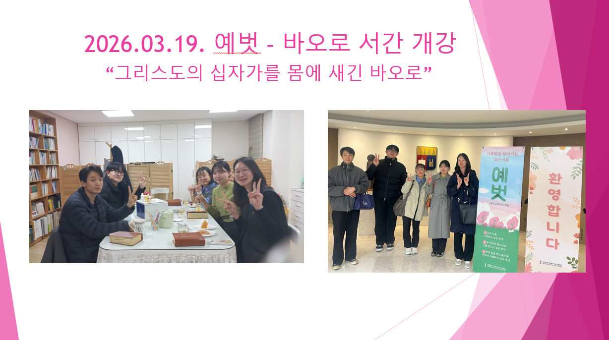 청년 PICK & TALK 예벗 - 바오로 서간, 마태오 복음 개강 2026-03-23 예벗 개강 했습니다. 3월19일 목요일 저녁 7시 바오로 서간, 3월21일 토요일 오후 2시 마태오 복음 다음 모임은 4월 16일과 4월 18일 입니다. 함께 하시고 싶은 분은 언제든지 오실 수 있습니다. 이전글2026년 예벗 안내와 3월 일정표 목록