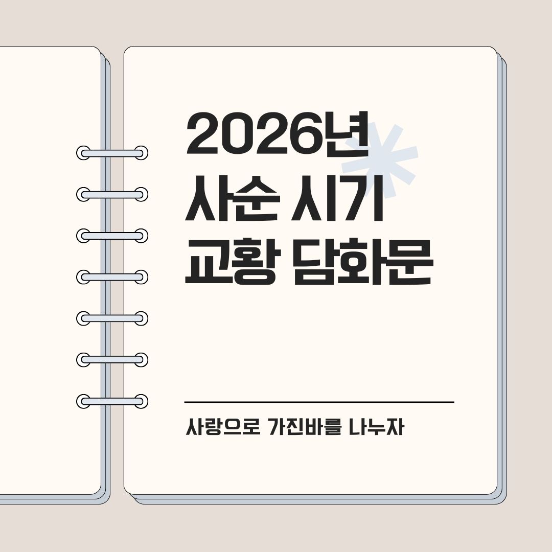 교회소식 2026년 사순 시기 교황 담화문 2026-02-17 전문은 아래를 클릭하세요. [담화] 2026년 사순 시기 교황 담화 | 한국천주교주교회의 이전글2024 축성생활의 날 담화 (유덕현 아빠스) 목록