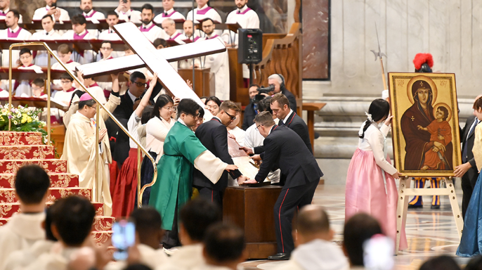 수녀원 소식 2026 WYD 십자가와 성모 성화 2026-04-21 수원교구를 순례중인 WYD 십자가와 성모 성화가 지난 4월 15일 여주수녀원에 오셨고, 현정수 신부님께서 수녀님들과 함께 미사를 봉헌하셨습니다. 2024.11.24보도 <한국 청년들이 11월 24일 성 베드로 대성전에서 거행된 ‘제39차 세계 젊은이의 날’ 미사 후 열린 WYD 십자가와 성모성화 이콘 전달식에서 포르투갈 청년들에게 받은 십자가를 힘을 합쳐 세우고 있다. 이로써 2027 서울 WYD를 향한 본격적인 여정을 보편 교회에 알렸다.> 이전글2026 위캔_가정의달&장애인의 날 이벤트 목록