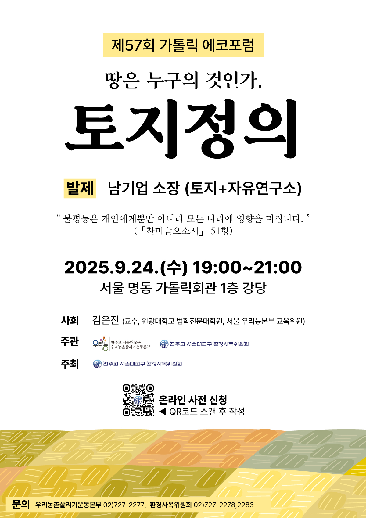 생명평화 [교육]제57회 가톨릭 에코포럼 2025-09-20 "기후변화,식량 안보,생태위기라는 시대의 어두운 과제들 때문에 흙은 경이로운 것만큼이나 우리의 돌봄의 대상이어야 했다. 인간에게 흙이야말로 지구의 가장 친밀한 부분이라는 말은 인간이 흙에 하는 것이 곧 지구에 하는 것이라는 말과 같다. 흙의 경이로움은 그래서 우리의 책임으로 이어질 수 밖에 없고 흙을 중요하게 다루는 환경 생태 책들이 인간과 문명에 대한 고발로 수렴하는 이유이기도 하다." <흙의 숨>유경수,2025,김영사 머릿말 중에서... 출처 <정원가의 열두달> 이전글[영상]Pope's Worldwide Prayer 목록