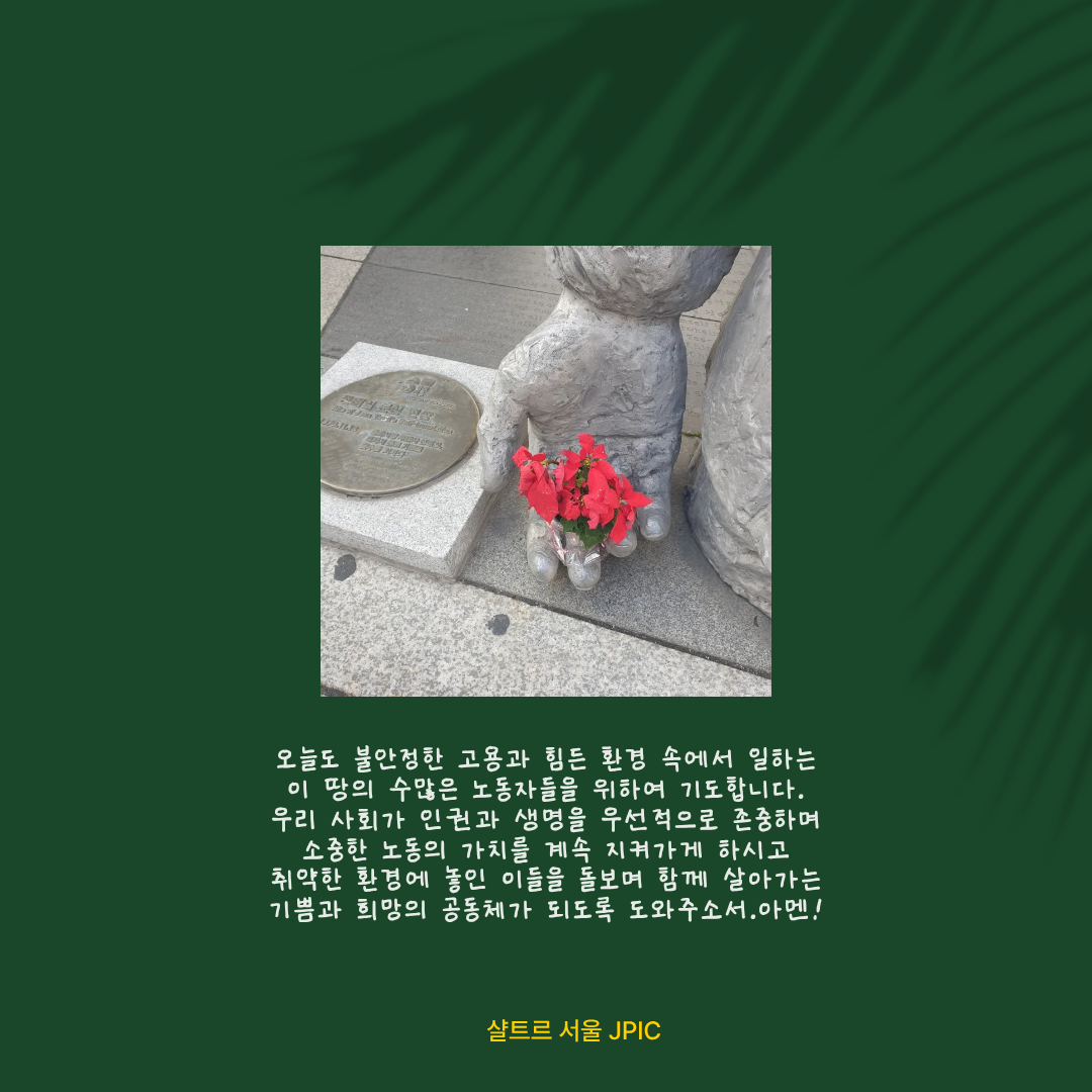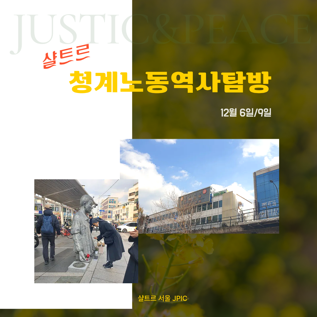 생명평화 20251206_청계노동현장 탐방 2025-12-28 지난 대림 2주일(인권주일) 사회교리주간을 맞아 명동과 아주 가까운 곳, 청계천로에 살아 숨쉬는 노동 인권역사의 현장을 찾았습니다. 1968년 16세부터 평화시장에서 미싱보조일을 시작하여 전태일 열사와 같은 시기를 사셨던 이숙희 선생님께서 동행해 주셨습니다. 이전글[연대] 11.26 정의기억연대 수요시위를 다녀오며 다음글2025 <모두의 성탄> 목록