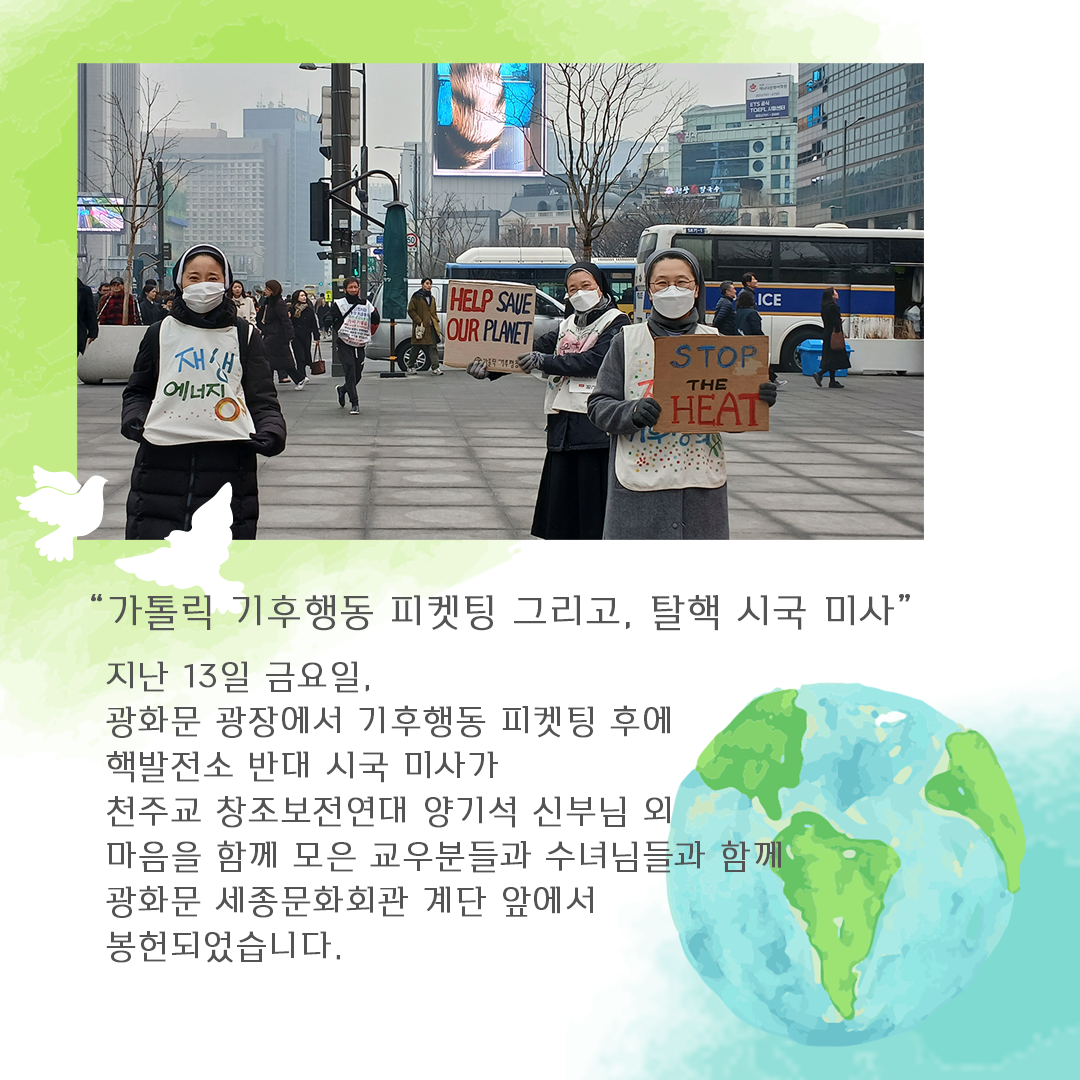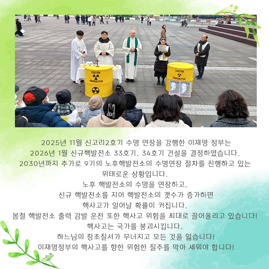 생명평화 [미사] 탈핵 & 핵발전소 반대 시국미사 2026-02-14 핵발전소 반대 광화문 시국미사를 공지합니다! 2025년 11월 신고리2호기 수명 연장을 강행한 이재명정부는 2026년 1월 신규핵발전소 33호기, 34호기 건설을 결정하였습니다. 2030년까지 추가로 9기의 노후핵발전소의 수명연장 절차를 진행하고 있는 위태로운 상황입니다. 노후 핵발전소의 수명을 연장하고, 신규 핵발전소를 지어 핵발전소의 갯수가 증가하면 핵사고가 일어날 확률이 커집니다. 봄철 핵발전소 출력 감발 운전 또한 핵사고 위험을 최대로 끌어올리고 있습니다! 핵사고는 국가를 붕괴시킵니다. 하느님의 창조질서가 무너지고 모든 것을 잃습니다! 이재명정부의 핵사고를 향한 위험한 질주를 막아 세워야 합니다! 핵사고의 위험에서 벗어나게 해 주시기를 주님께 청하오며 간절한 마음을 담아 핵발전소 반대 광화문 시국미사를 봉헌합니다! 많은 관심과 참석바랍니다! 일시: 2026. 2. 20일 / 27일 오후 12시30분 장소: 세종문화회관 계단앞 미사집전: 천주교창조보전연대 양기석신부님 외 이전글[교황담화문] 2026 세계 평화의 날 목록