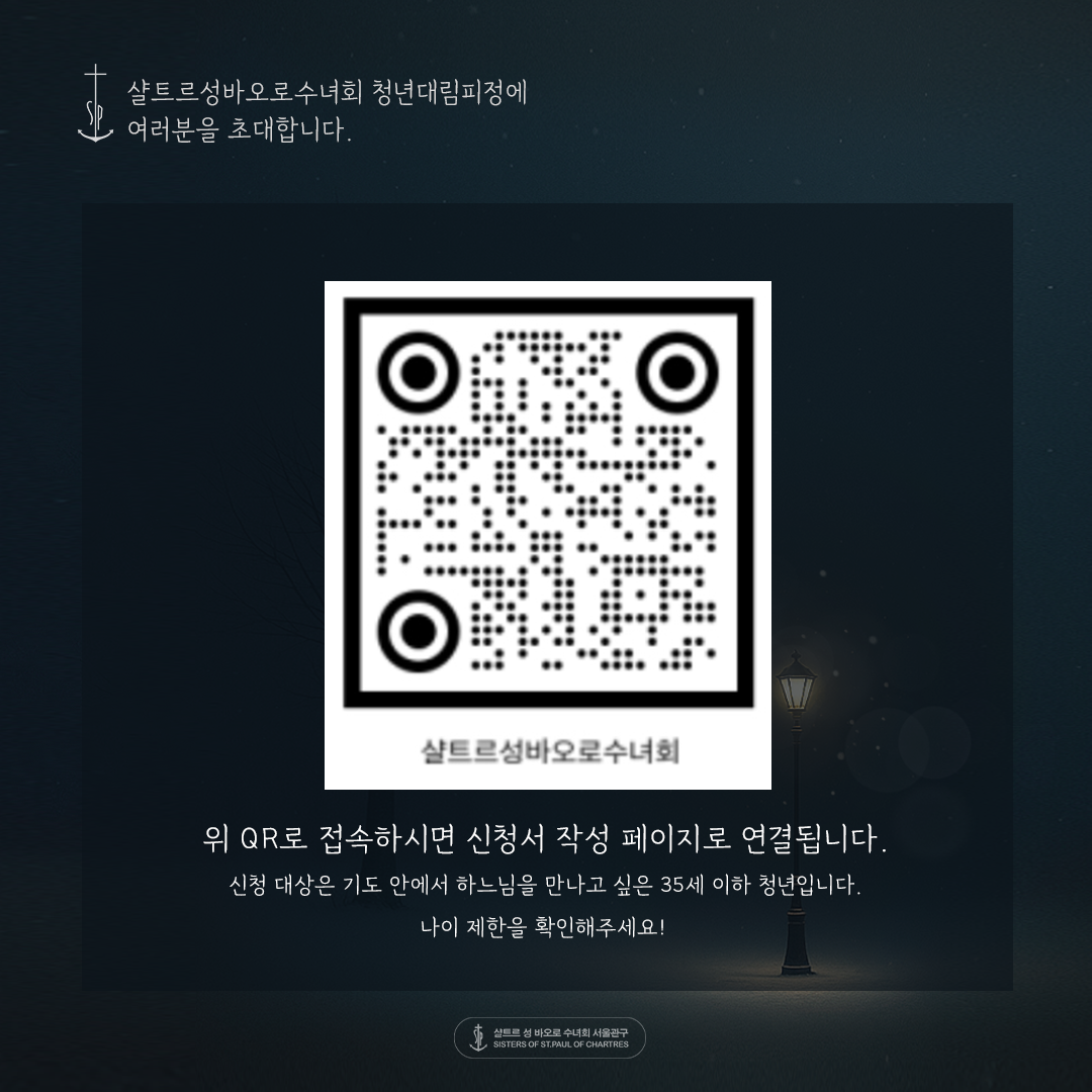 청년 PICK & TALK 2025 대림청년피정에 여러분을 초대합니다 2025-10-29 일 시 : 2025. 12. 13.(토) 오전 10시부터 6시까지 장 소 : 샬트르성바오로수녀회 서울관구 바오로홀 (서울시 중구 명동길 74-2 명동성당 성모동산 뒷편) 대 상 : 기도 안에서 하느님을 만나고 싶은 35세 이하 청년 30명 (선착순) 나이 제한으로 신청이 불가할 수 있습니다 신청 문의 : 샬트르성바오로수녀회 서울관구 홈페이지 https://www.spcseoul.or.kr 02)3706.3233 / 010.3627.5071 이혜영 루갈다 수녀 신청 방법 : QR 또는 링크로 접속하여 신청서 작성 https://forms.gle/GhtrNnAjyS9Wd1JY6 신청 확인 문자를 받으신 후 참가비를 입금하시면 신청이 완료됩니다. 이후, 담당 수녀가 피정 공지사항을 문자로 보내드립니다. 참 가 비 : 1만원 준 비 물 : 묵주, 필기도구, 개인 텀블러 신청마감 : 2025. 11. 28. (금) 이전글<기도8-그 외딴 곳> 여덟 번째 이야기 다음글예수님의 작은 벗들 "성지순례" 목록