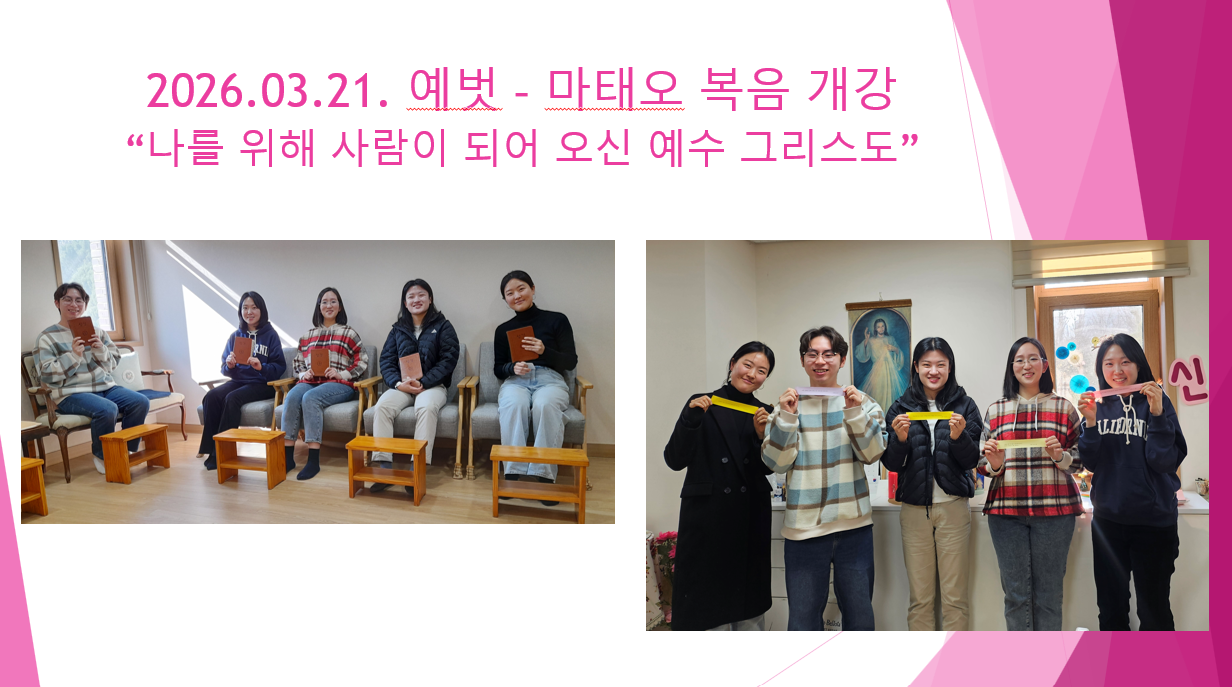 청년 PICK & TALK 예벗 - 바오로 서간, 마태오 복음 개강 2026-03-23 예벗 개강 했습니다. 3월19일 목요일 저녁 7시 바오로 서간, 3월21일 토요일 오후 2시 마태오 복음 다음 모임은 4월 16일과 4월 18일 입니다. 함께 하시고 싶은 분은 언제든지 오실 수 있습니다. 이전글2026년 예벗 안내와 3월 일정표 목록