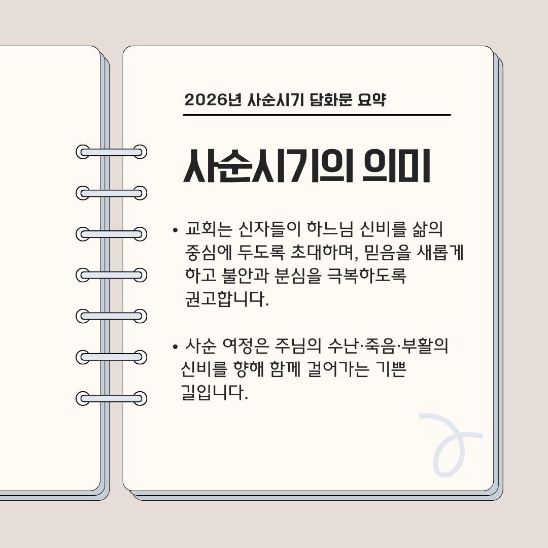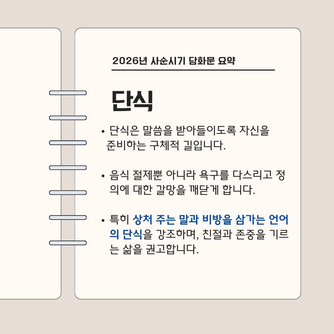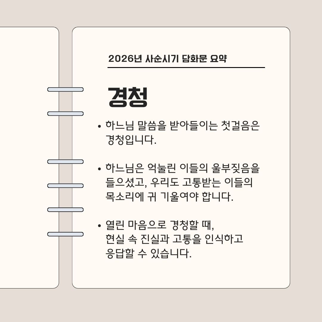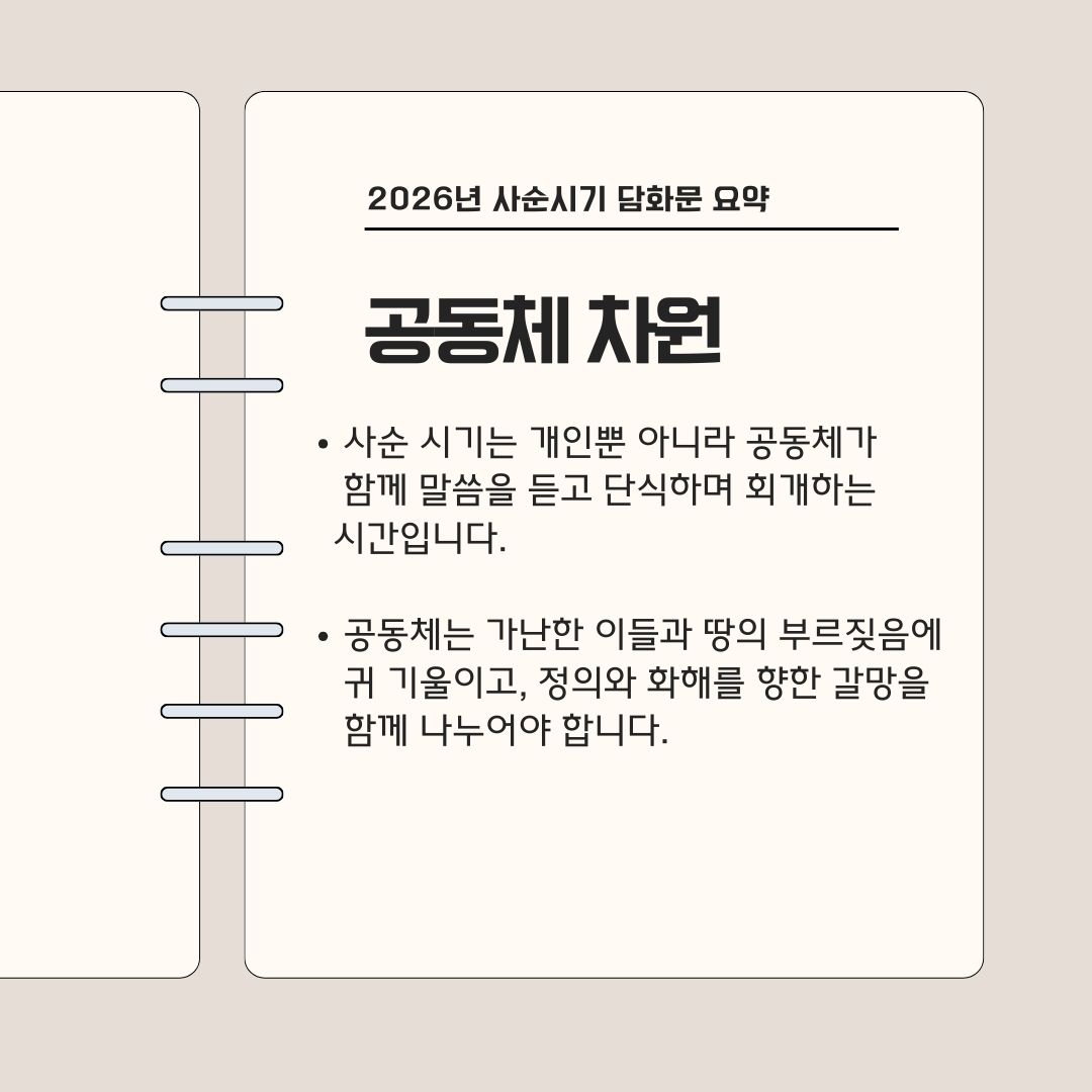교회소식 2026년 사순 시기 교황 담화문 2026-02-17 전문은 아래를 클릭하세요. [담화] 2026년 사순 시기 교황 담화 | 한국천주교주교회의 이전글2024 축성생활의 날 담화 (유덕현 아빠스) 목록