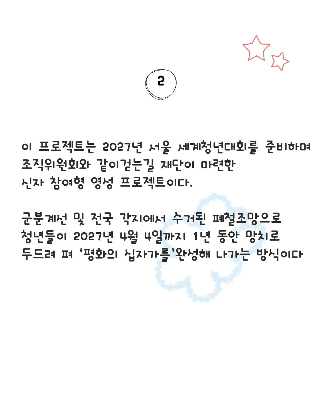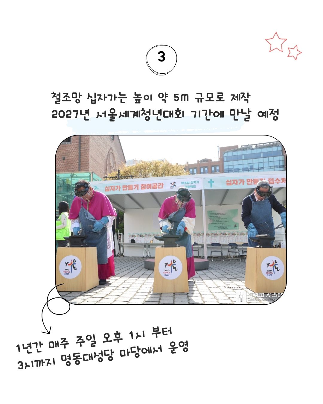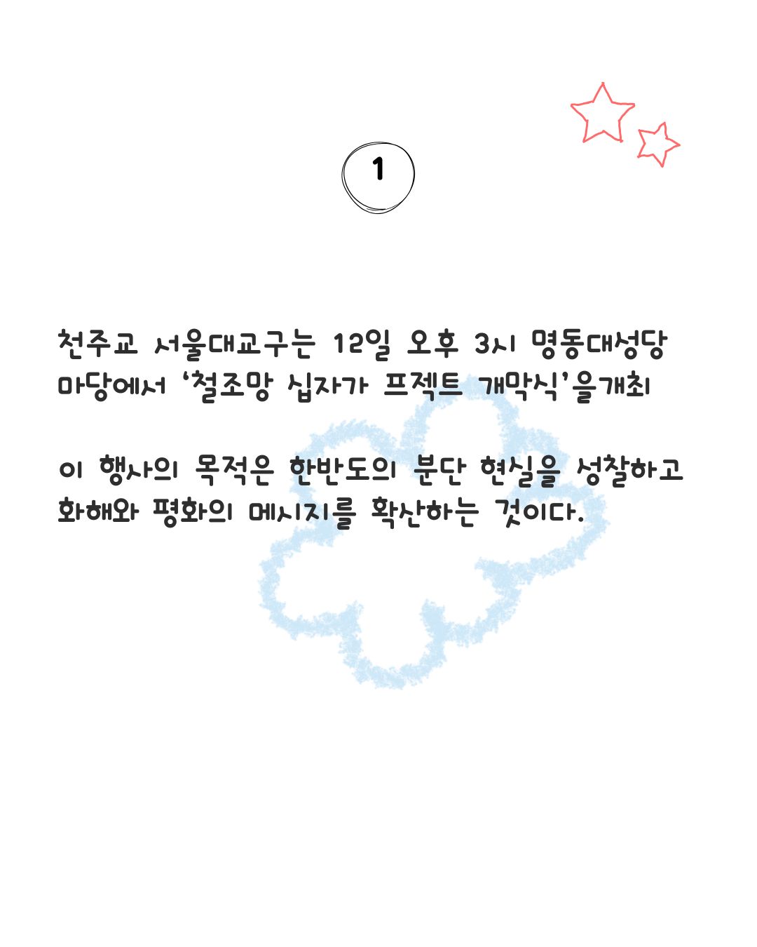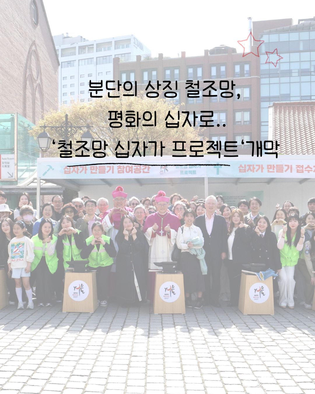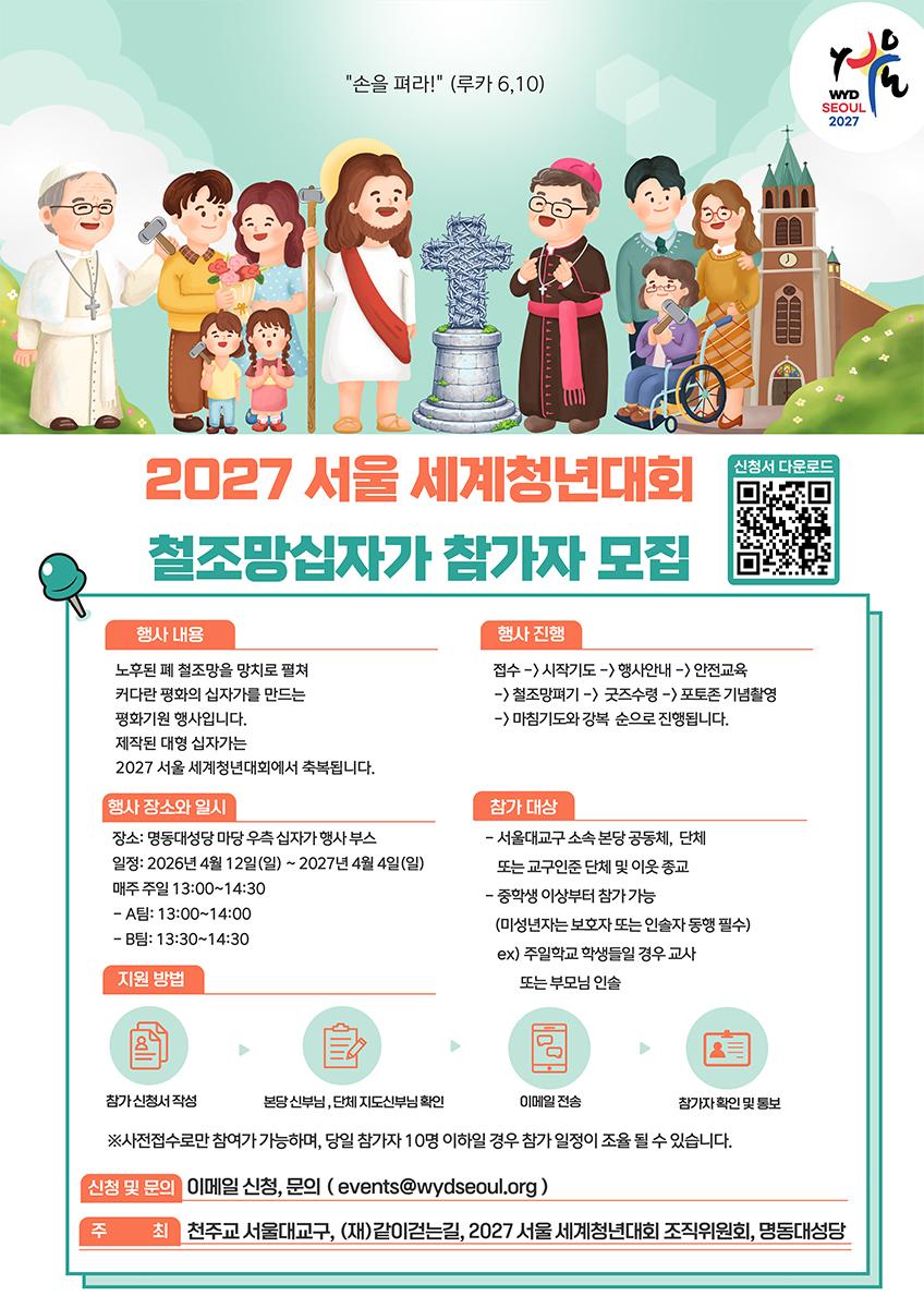 교회소식 서울 대교구 WYD 분단의 상징 철조망, 평화의 십자로.. ‘철조망 십자가 프로젝트‘개막 2026-04-22 기사 전문은 아래를 확인하세요. 서울대교구 교구 보도자료 이전글교황, '민간인 보호' 긴급 호소…전쟁 당사자들에게 '휴전' 촉구 다음글2026년 성소주일 담화문 (교황 레오 14세) 목록