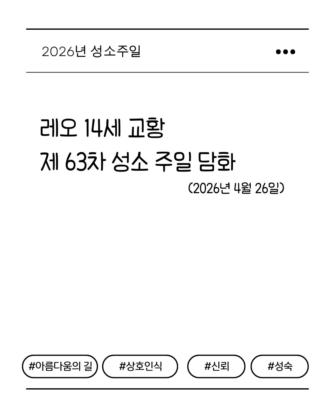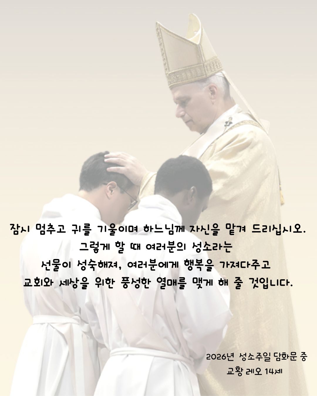 교회소식 2026년 성소주일 담화문 (교황 레오 14세) 2026-04-22 레오 14세 교황님의 제63차 성소주일 담화문 전문은 아래에서 확인가능합니다. 2026년 제 63차 성소주일 담화문 이전글서울 대교구 WYD 분단의 상징 철조망, 평화의 십자로.. ‘철조망 십자가 프로젝트‘개막 목록